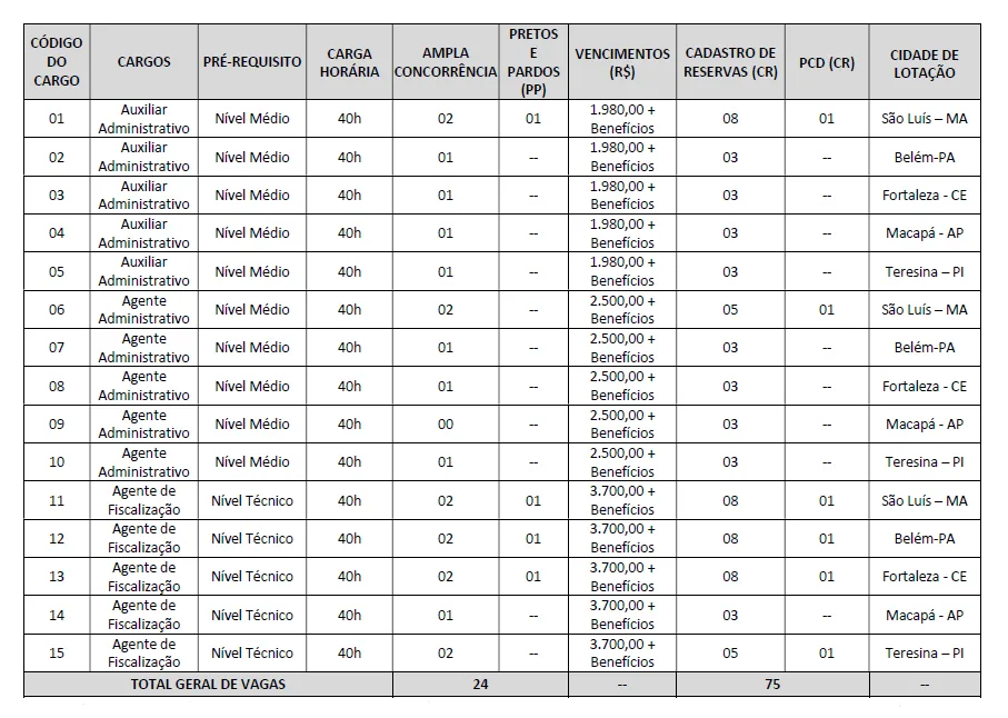 O edital do processo seletivo do CRT-02 (Conselho Regional dos Técnicos Industriais da 2ª Região) foi divulgado, oferecendo um total de 99 vagas, das quais 24 são para contratação imediata e 75 para formação de cadastro reserva (CR). As vagas são distribuídas entre as cidades de São Luís/MA, Belém/PA, Fortaleza/CE, Macapá/AP e Teresina/PI.