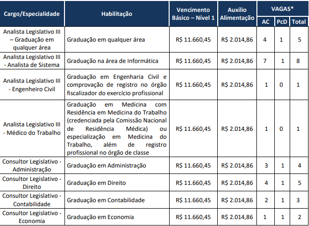 Os requisitos básicos para cada cargo na ALESC, bem como a disponibilidade de vagas, podem ser conferidos na tabela abaixo: