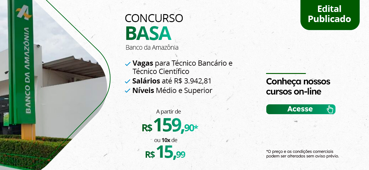 Foi publicado o Edital do Concurso BASA (Banco da Amazônia)! Com um total de 50 vagas + 400 Cadastro de Reserva para Técnico Bancário e Técnico Científico de Níveis Médio e Superior, este concurso oferece um salário atrativo, chegando a R$ 3.942,81. Sob organização da Banca Cesgranrio, as inscrições abrem do dia 02/08/2024 a 26/08/2024, e as provas estão previstas para 20/10/2024.