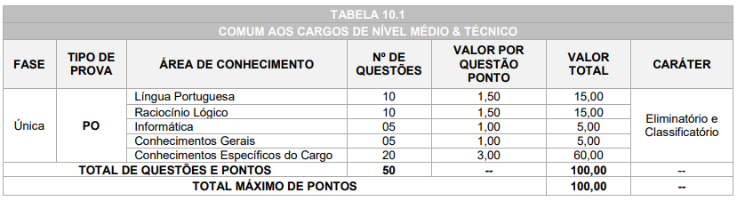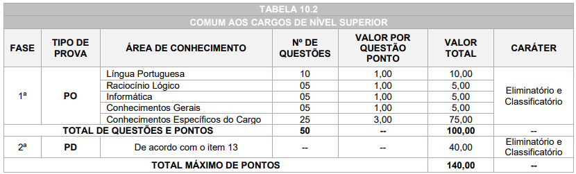 • Prova objetiva (PO) de caráter eliminatório e classificatório para todos os cargos;