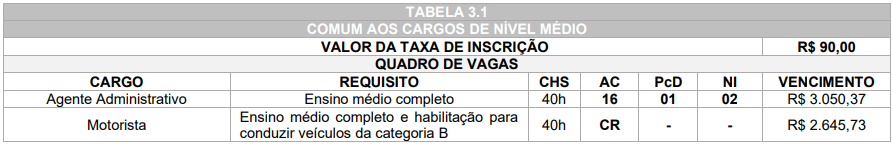• Cargos de nível médio: R$ 90,00.