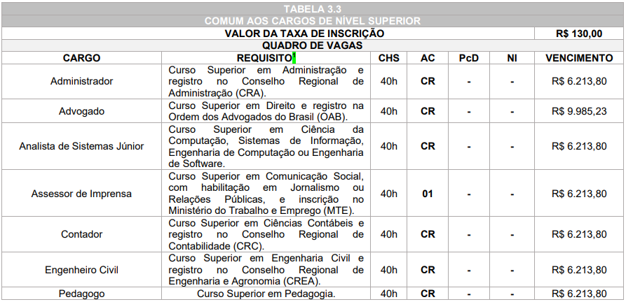 As oportunidades são de níveis médio, técnico e superior, para os cargos das áreas administrativa, jurídica, tecnologia da informação, comunicação social, contabilidade, engenharia e outras, e a remuneração pode chegar em até R$ 9.985,23.