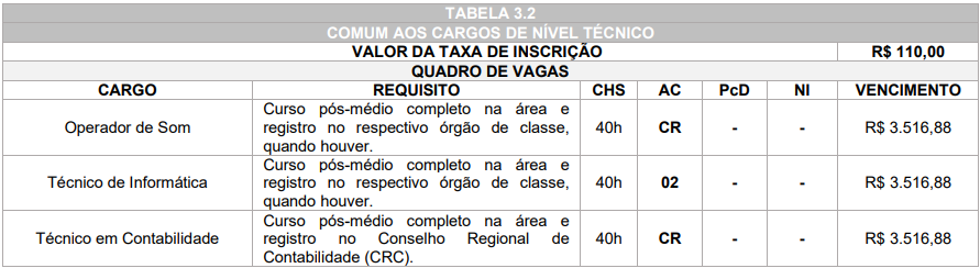 • Cargos de nível técnico: R$ 110,00.