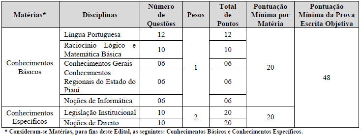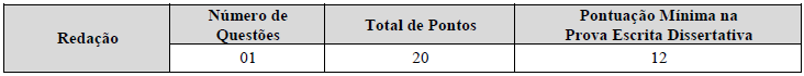 A prova objetiva terá duração de 05 (cinco) horas e consistirá de uma Prova Escrita Objetiva do tipo múltipla escolha, com 05 (cinco) alternativas, e uma única resposta correta, contendo 60 (sessenta) questões, totalizando 80 (oitenta) pontos, e de uma Prova Escrita Dissertativa, na qual o candidato demonstre o domínio da modalidade escrita formal da língua portuguesa, apresente e defenda, com argumentos, um ponto de vista em relação ao tema proposto, demonstre domínio dos mecanismos linguísticos que assegure a progressão e o encadeamento das ideias e apresente uma conclusão adequada à argumentação defendida, totalizando 20 (vinte) pontos.