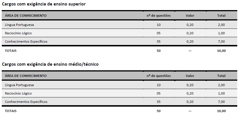 As áreas de conhecimento exigidas, o número de questões e o valor que será atribuído a cada uma, estão dispostos