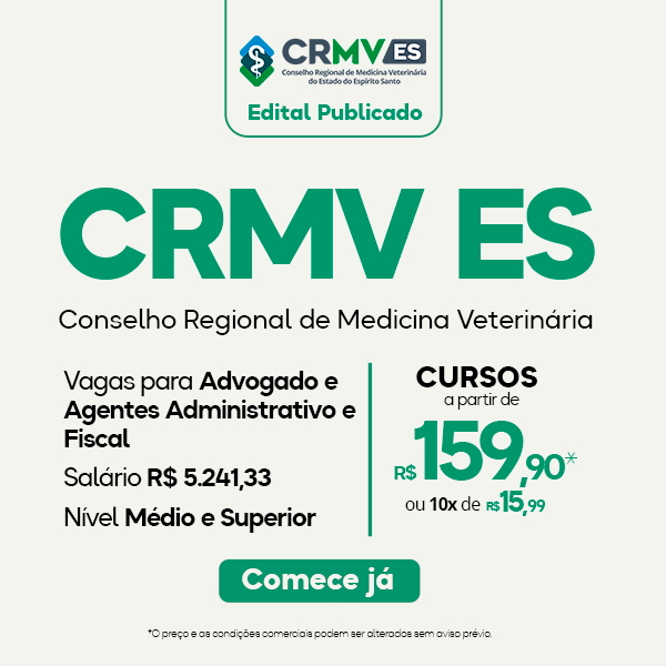 Foi publicado o Edital do aguardado novo Concurso CRMV ES (Conselho Regional de Medicina Veterinária do Espírito Santo)! Com 90 vagas + Cadastro de Reserva para Advogado e Agentes Administrativo e Fiscal, de níveis Médio e Superior, este concurso oferece salário atrativo de até R$ 5.241,33.