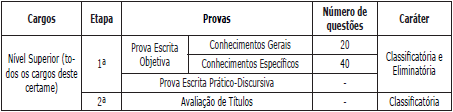 A prova escrita prático-discursiva, de caráter eliminatório e classificatório, valerá 40 pontos e abrangerá conhecimentos específicos pertinentes a cada cargo, constantes do conteúdo programático e, ainda, a capacidade de expressão na modalidade escrita e o uso das normas do registro formal culto da Língua Portuguesa.