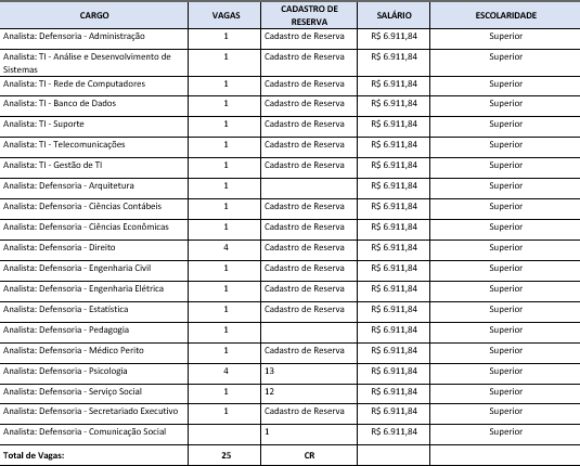 Para o concurso 2023, a Defensoria Pública do Pará oferece 25 vagas de nível superior destinadas ao cargo de Analista. Este cargo é dividido em diversas especialidades. Confira abaixo todas as oportunidades, bem como a quantidade de vagas para cada uma: