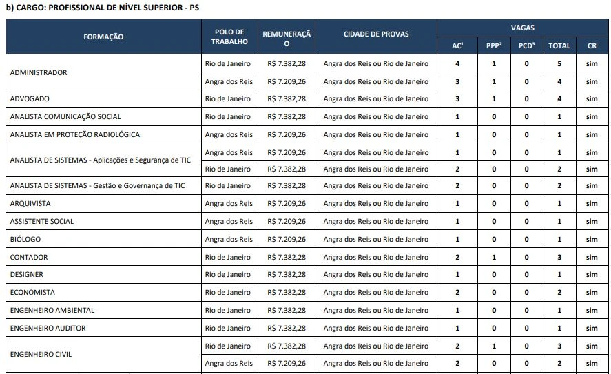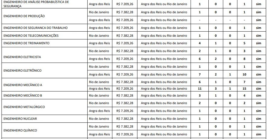Atribuições: Planejar, implantar, acompanhar e avaliar processos administrativos na divisão. Elaborar projetos, pareceres e relatórios nos quais se exija a aplicação de conhecimentos de Administração. Desempenhar tarefas correlatas. Avaliar a dimensão ambiental do empreendimento de Angra 3, acompanhar auditorias e certificações, rondas ambientais, planejar e viabilizar a recuperação de áreas degradadas e indicar o destino final de resíduos. Avaliar ambientalmente as áreas de influência da Usina de Angra 3, segundo a ISO 14001 e demais certificações. Monitorar os possíveis impactos ambientais provocados pela operação da Usina de Angra 3 nas comunidades de algas e peixes marinhos, através da obtenção de parâmetros ecológicos como riqueza, equitabilidade, diversidade, taxonomia e herborização histologia e organização ictiológica. Realizar coleta de dados em campo, análise e elaboração de relatórios técnicos. Realizar mergulhos livres e autônomos para o exercício das atividades.