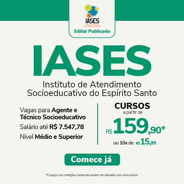 O Concurso IASES ES (Instituto de Atendimento Socioeducativo do Espírito Santo) teve o prazo de inscrições prorrogado até o dia 20 de novembro de 2025. São 1.008 vagas para os cargos de Técnico Superior Socioeducativo e Agente Socioeducativo, com salários que variam de R$ 6.397,64 a R$ 8.347,78. A banca organizadora é o IDCAP, e as provas estão marcadas para 18 de janeiro de 2026.