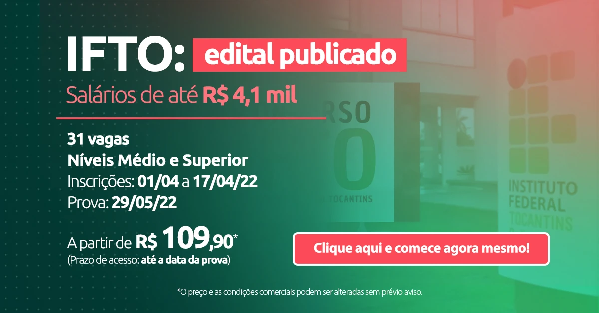 O concurso IFTO publicou edital com 31 vagas para os níveis médio e superior, com salários de até R$ 4,1 mil. As inscrições vão de 01 a 17/04 e a prova será em maio. Então, para você saber como fazer o concurso do ifto e já iniciar a sua preparação, leia o texto a seguir!
