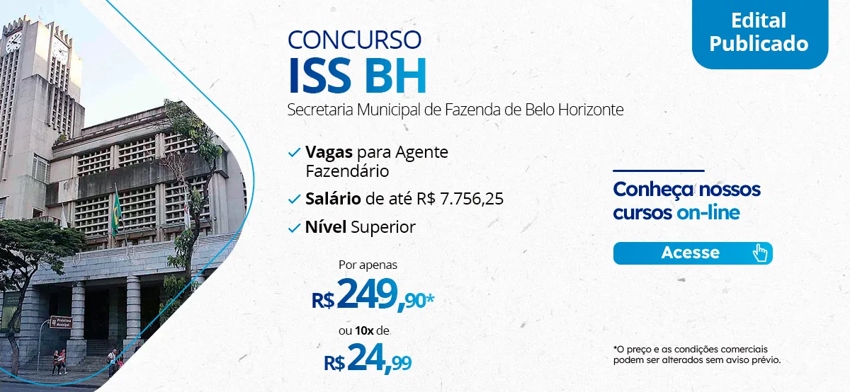 Foi publicado o aguardado Edital do Concurso ISS BH (Secretaria Municipal de Fazenda de Belo Horizonte). Com um total de 20 vagas + Cadastro de Reserva para Agente Fazendário de nível superior, o concurso oferece salário atrativo, chegando a R$ 7.756,25. Sob organização da Banca Consulpam, as inscrições aconteceram do dia 05/02/2024 a 05/03/2024, e as provas foram adiadas.