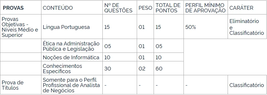 | Analista de Negócios 1A | 30 + 180 CR | R$ 6.130,00 | Graduação de nível superior em qualquer área + pós nas áreas de Administração Pública ou Direito ou experiência profissional superior a 3 anos nas atividades a serem desenvolvidas. |