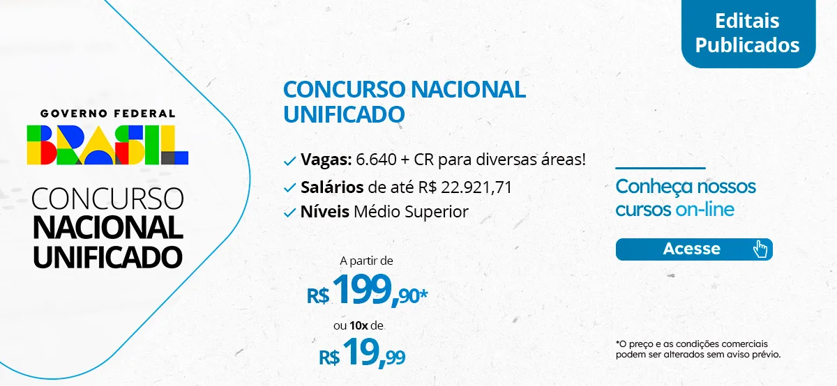 Foram publicados os Editais do Concurso Nacional Unificado. São 6.640 vagas + CR, divididas entre 21 órgãos. As inscrições estiveram disponíveis até 9 de fevereiro. Já as provas, foram oficialmente confirmadas para o dia 18/08/2024. Agora, você já pode consultar os locais de prova!