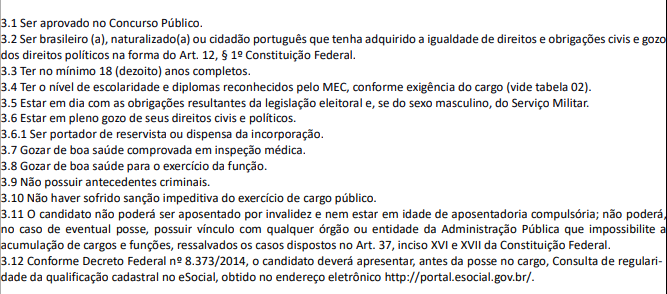 Os requisitos básicos para todos os cargos, de acordo com o edital, constam abaixo. Lembre-se que os requisitos para cada cargo em específico deve ser conferido no edital na íntegra.