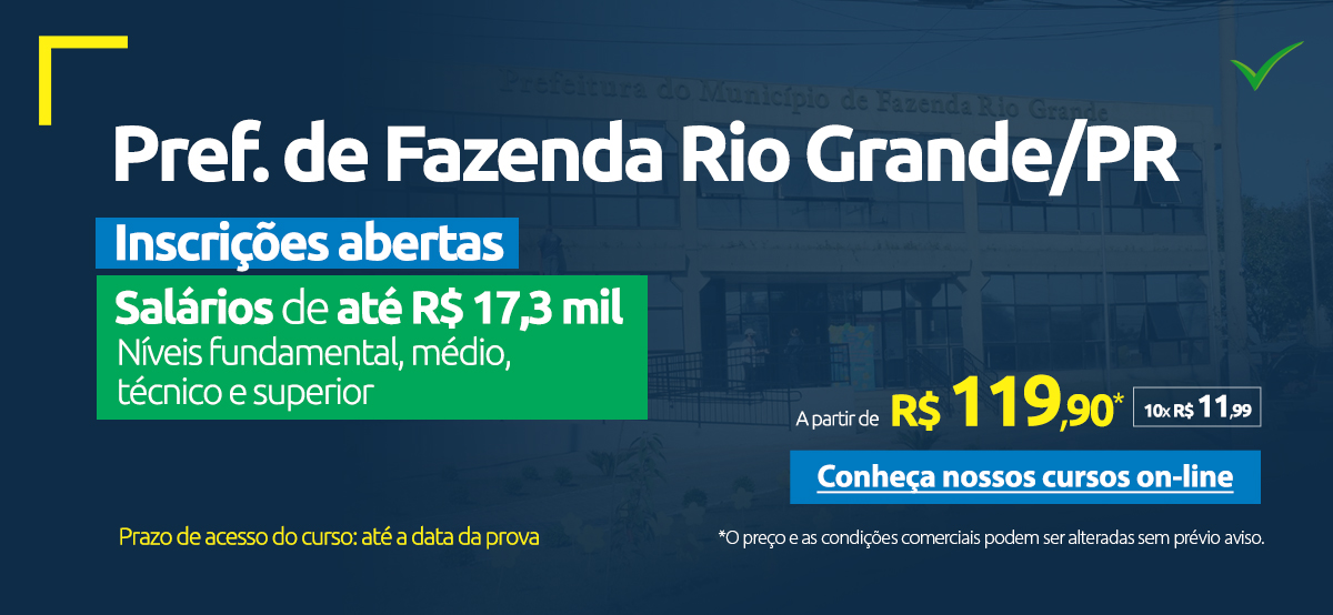 O concurso para a Prefeitura de Fazenda Rio Grande, no Paraná, está com 291 vagas disponíveis para cargos de todos os níveis de escolaridade, com salários que podem chegar a R$ 17,3 mil. Inscrições devem ser realizadas até 05/03; provas acontecem em 02/04.