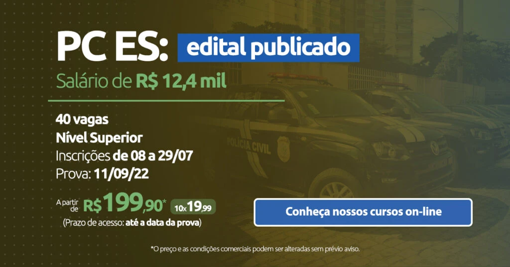 O concurso PC ES teve seu edital publicado para 40 vagas de nível superior o cargo de Delegado da Polícia Civil do Espírito Santo. O salário é de R$ 12,4 mil e as inscrições começam na sexta-feira (8 de julho). Preparamos um texto especial com tudo o que você precisa saber, confira a seguir!
