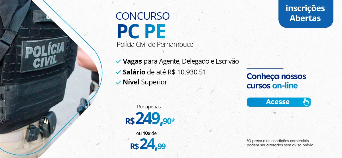 Concursos públicos oferecem ótimas oportunidades, então é natural que a concorrência seja grande. Mas o candidato que otimiza seu estudo está um passo à frente. E contar com um Curso Preparatório é o principal método para você conquistar sua aprovação no Concurso PC PE.