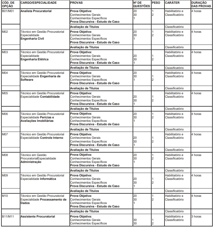 • no período da TARDE: Provas Objetivas e Discursivas – Estudo de Caso para os cargos de Analista Procuratorial e Técnico em Gestão Procuratorial – todas as Especialidades.