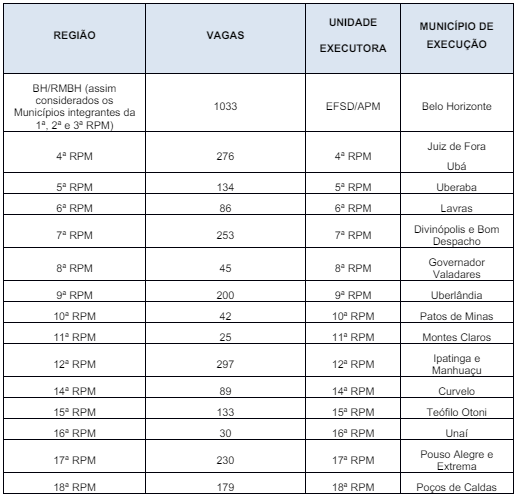 Confira abaixo a quantidade de vagas para cada unidade executora nos municípios de Minas Gerais: