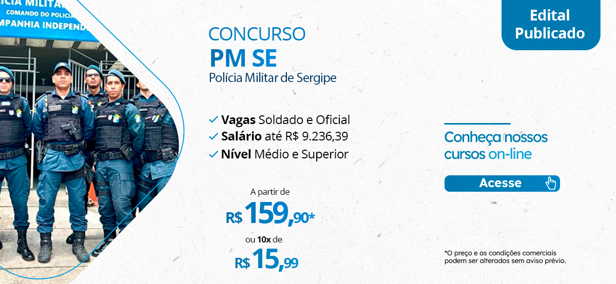Foi publicado o Edital do aguardado novo Concurso PM SE (Polícia Militar de Sergipe)! Com 335 vagas para Soldado e Oficial, de Nível Médio e Superior, este concurso oferece salário atrativo de até R$ 9.236,39.
