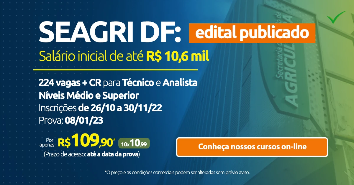 Conforme mencionado no início deste texto, a Secretaria de Estado de Agricultura, Abastecimento e Desenvolvimento Rural do Distrito Federal – SEAGRI DF divulgou edital de concurso público com vagas imediatas e em cadastro de reserva, de níveis Médio e Superior, para Técnicos e Analistas.