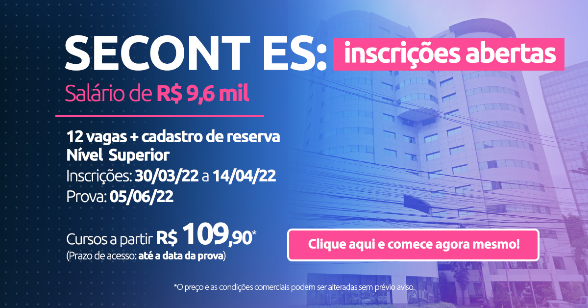 O concurso Secont ES publicou edital com 12 vagas para o nível superior, com salário de R$ 9,6 mil. As inscrições foram entre março e abril, a prova seria em junho mas foi adiada. Então, para você saber como fazer o concurso da secont es e já iniciar a sua preparação, leia o texto a seguir!