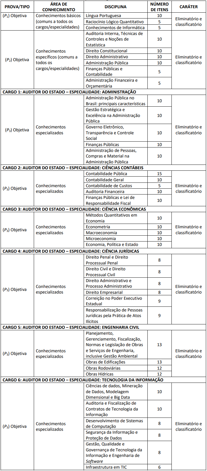 | Auditor do Estado Especialidade: Ciências Contábeis | 5 + 24 CR | Nível superior em Ciências Contábeis + registro no órgão de classe | |