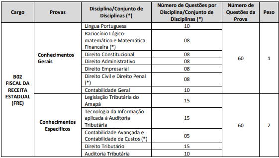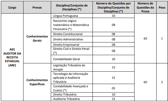 Por outro lado, a prova objetiva para Auditor da Receita Estadual será aplicada no dia 25 de setembro. A distribuição das questões pode ser visualizada no quadro abaixo: