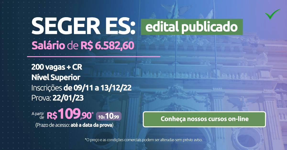 Afinal, a sua preparação só precisa durar o tempo necessário para garantir a vaga dos seus sonhos. Com toda a certeza um dos nossos cursos irá aumentar muito as suas chances de conquistar uma das vagas no concurso da SEGER ES, venha para o Aprova e descubra o segredo para ser aprovado!
