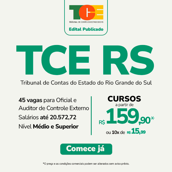 Saiu edital do Concurso TCE RS (Tribunal de Contas do Estado do Rio Grande do Sul) com 45 vagas para os cargos de Auditor de Controle Externo (nível superior) e Oficial de Controle Externo (nível médio), com salários que podem chegar a R$ 20.572,72.