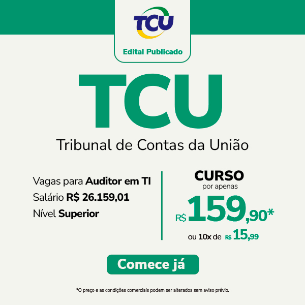 O tão aguardado edital do Concurso TCU (Tribunal de Contas da União) foi oficialmente publicado! São 20 vagas imediatas + 20 em cadastro reserva para o cargo de Auditor Federal de Controle Externo na área de Tecnologia da Informação, com salário inicial de R$ 26.159,01. As provas objetivas e discursivas serão aplicadas no dia 22 de fevereiro de 2026, sob a organização da banca Cebraspe.