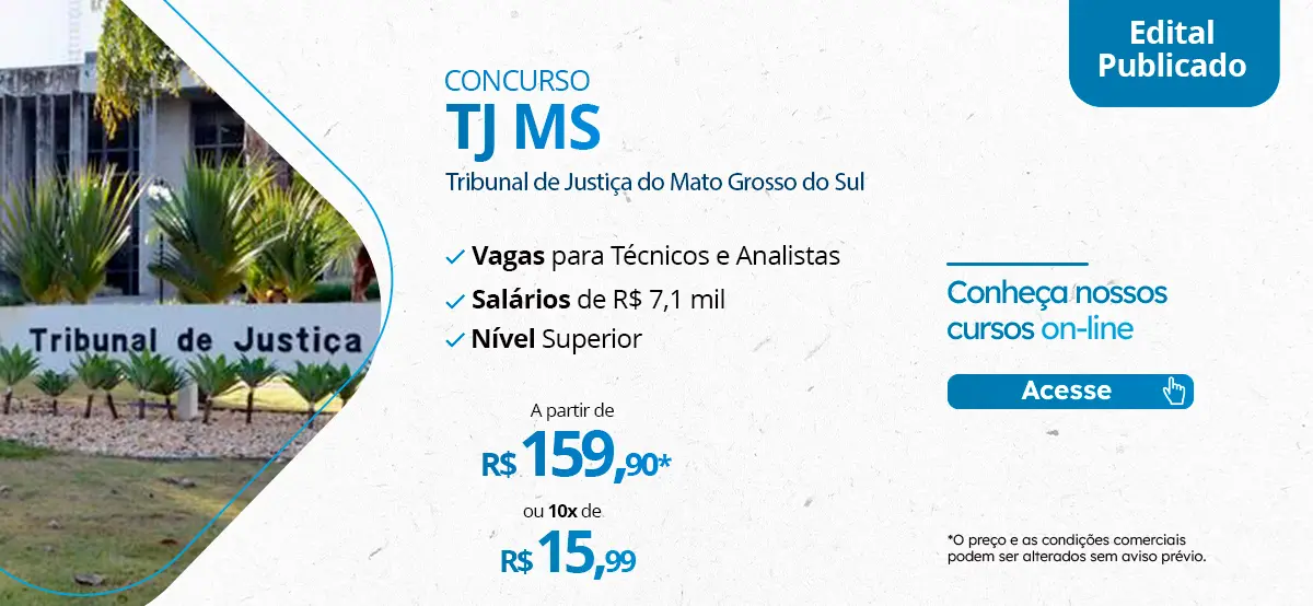 Concursos públicos oferecem ótimas oportunidades, então é natural que a concorrência seja grande. Mas o candidato que otimiza seu estudo está um passo à frente. E contar com um Curso Preparatório é o principal método para você conquistar sua aprovação no Concurso TJ MS 2024.