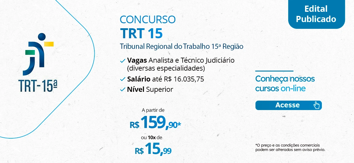 Você sabia que pode se preparar desde já? Chegou a hora de focar nos estudos para alcançar sua aprovação. E contar com um Curso Preparatório é o principal método para você conquistar sua aprovação no Concurso TRT 15 2024.