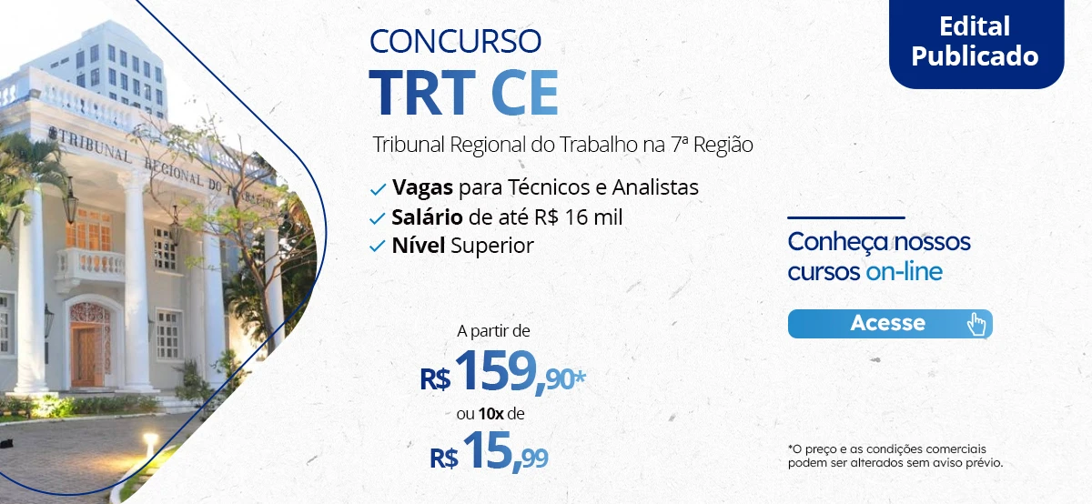 Nesta terça-feira, foi publicado o edital para o Concurso TRT CE. Com 2 vagas imediatas mais formação de cadastro reserva para diversos cargos, o período de Inscrições é de 19/06/2024 a 22/07/2024. Neste artigo você confere todos os detalhes do edital. É só continuar a leitura.