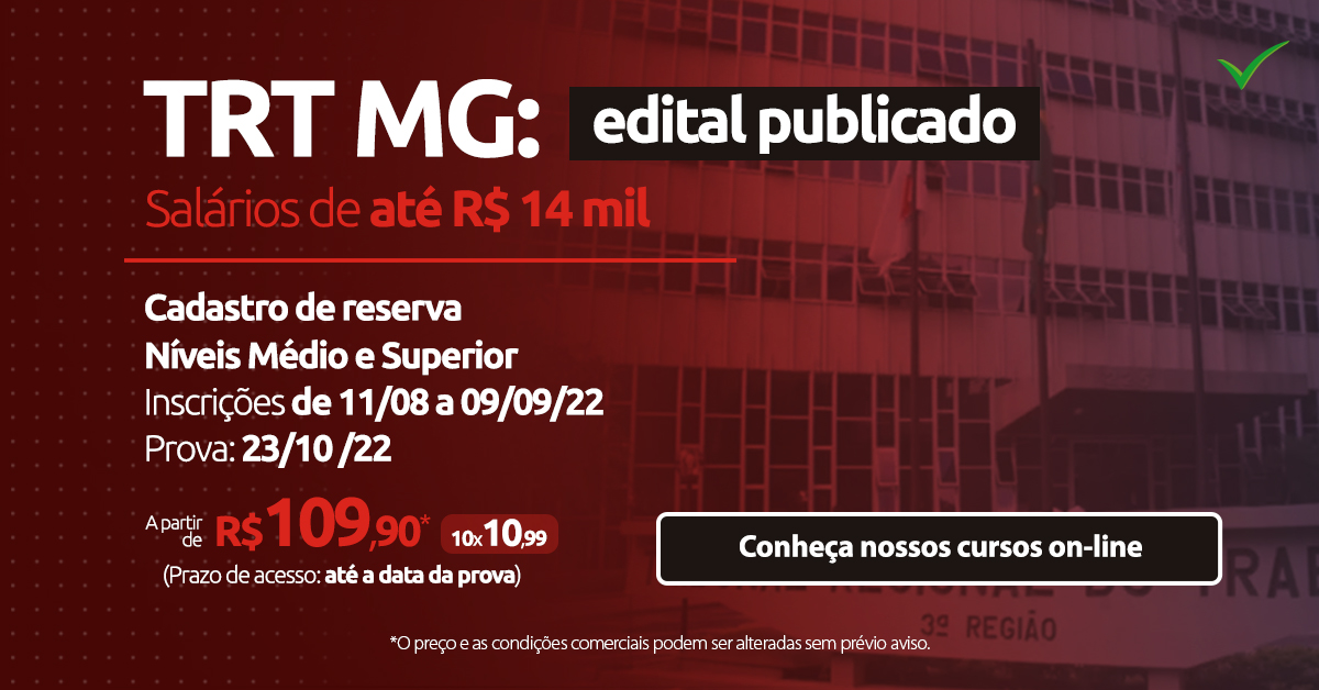O concurso TRT MG acaba de ter seu edital publicado! O Tribunal Regional do Trabalho de Minas Gerais abriu vagas para os níveis médio e superior, os salários podem chegar a R$ 12,4 mil. Por isso, se o seu objetivo é participar da futura seleção, não deixe de conferir o texto abaixo!