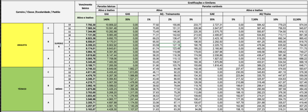 Confira abaixo a estrutura remuneratória completa do TRT MG e seus respectivos níveis: