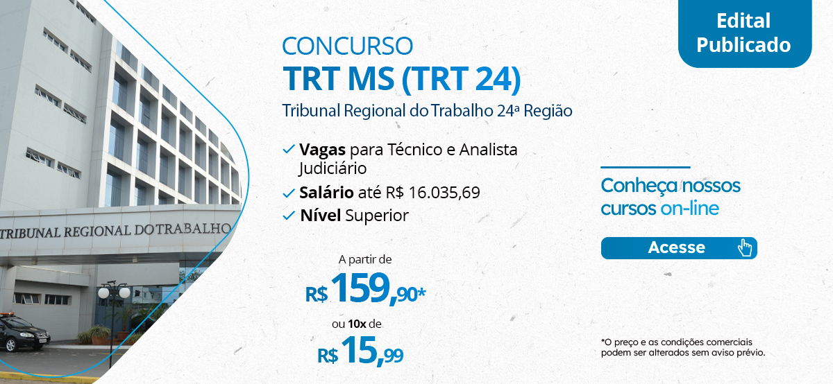 Você sabia que pode se preparar desde já? Chegou a hora de focar nos estudos para alcançar sua aprovação. E contar com um Curso Preparatório é o principal método para você conquistar sua aprovação no Concurso TRT 24 MS 2024.