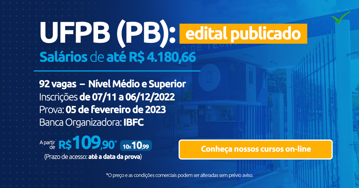 Afinal, a sua preparação só precisa durar o tempo necessário para garantir a vaga dos seus sonhos. Com toda a certeza um dos nossos cursos irá aumentar muito as suas chances de conquistar uma das vagas no concurso UFPB, venha para o Aprova e descubra o segredo para ser aprovado!