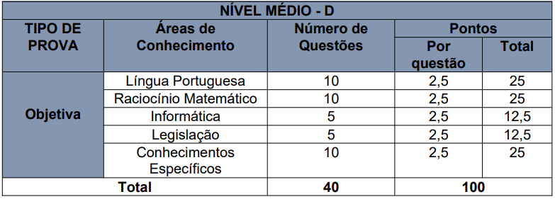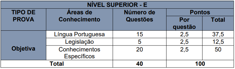A prova objetiva será composta por 40 questões de múltipla escolha, com cinco alternativas cada com apenas uma alternativa correta.