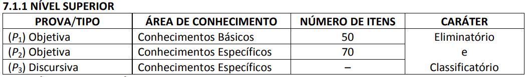 De acordo com o último edital, os candidatos foram testados através de uma prova objetiva e discursiva, que foi realizada de acordo com a tabela abaixo: