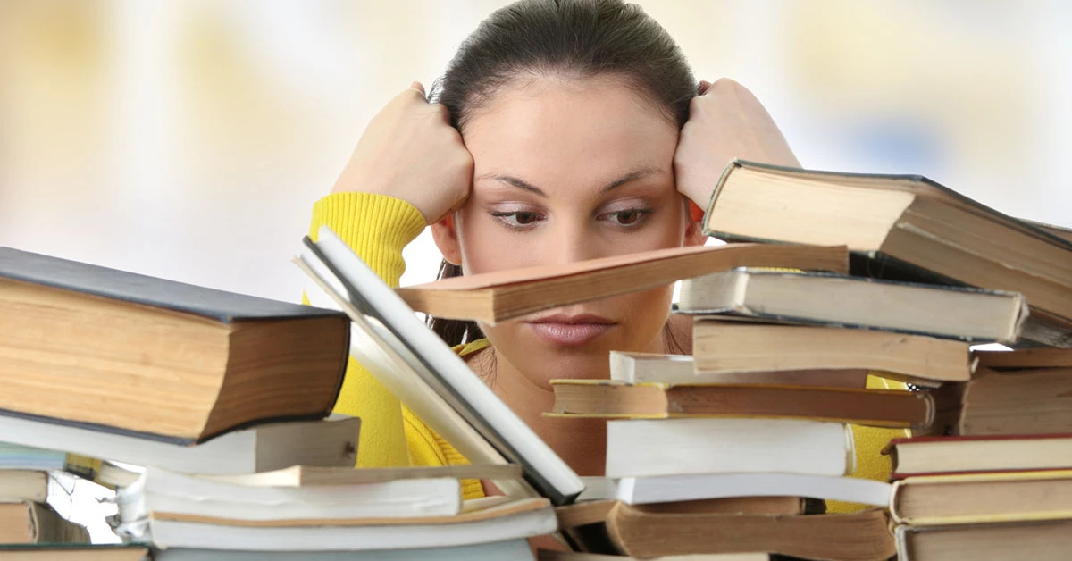 Young woman sitting behind books; Shutterstock ID 63771601; PO: aol; Job: production; Client: drone
